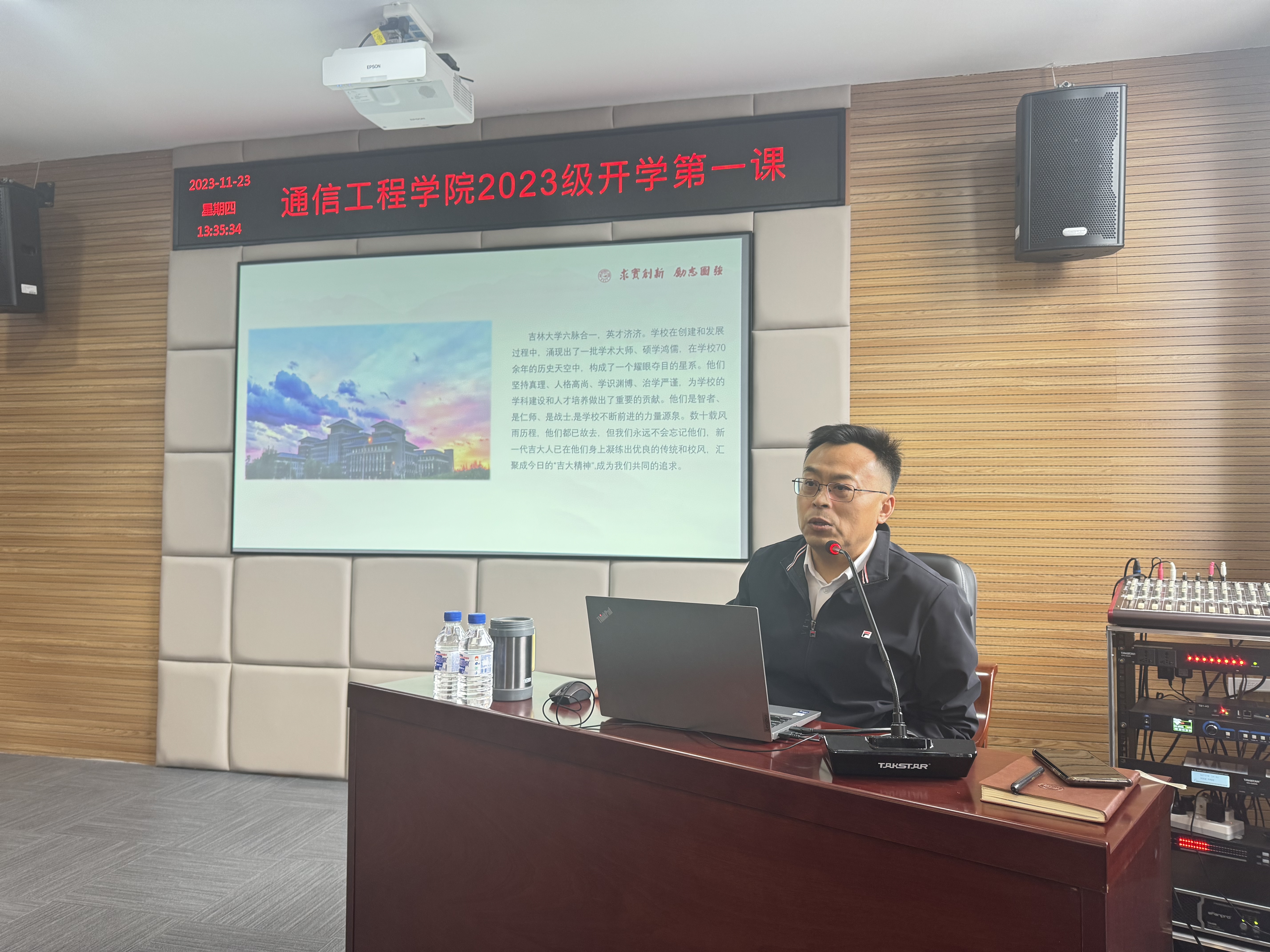 党委书记董宏志以《吉大,因你而骄傲》为主题,为2023级新生讲授了“开学第一课”。学院2023级部分本科生、研究生代表参加了本次活动。活动由学院党委副书记刘星彤主持。