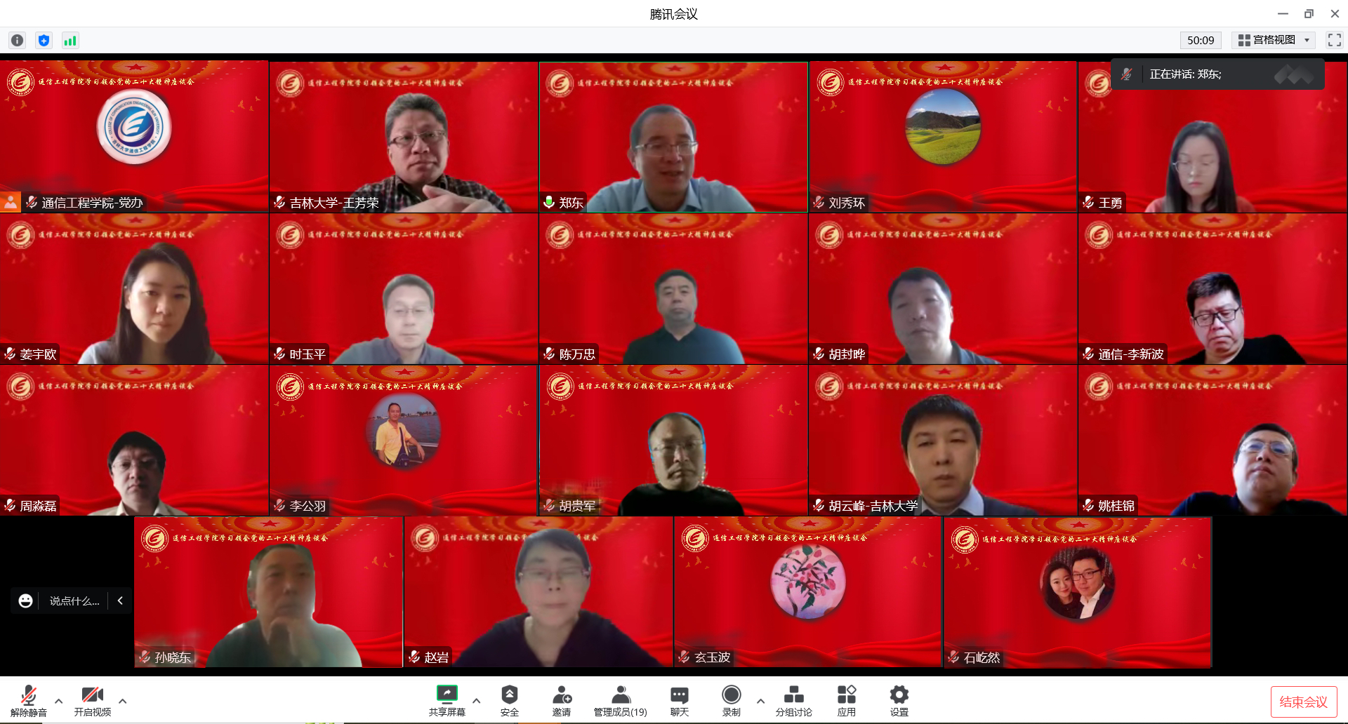 九三学社李月老师表示疫情期间党组织对于青年学生的关爱和温暖令她非常感动、备受鼓舞;九三学社陈万忠老师、民盟胡贵军老师、民盟李公羽老师、民盟王勇老师、民盟玄玉波老师重点关注了报告中的教育科技和人才方面,表示作为高校老师,要做好教书育人工作,把创新贯彻到科研工作和学生培养的全过程;民革王芳荣老师、九三学社胡云峰老师谈了二十大报告里面对于教师在人才培养方面的重要指导意义;九三学社刘秀环老师表示将牢记为祖国培养优秀建设者和接班人的神圣使命,为国家培养高素质复合型新工科人才贡献一己之力;民进姚桂锦老师、民革孙晓东老师表示要做青年学生的引路人,教好课做好科研工作;民革周淼磊老师、民革石屹然老师表示要努力提高自身的政治思想素质,坚定政治立场。