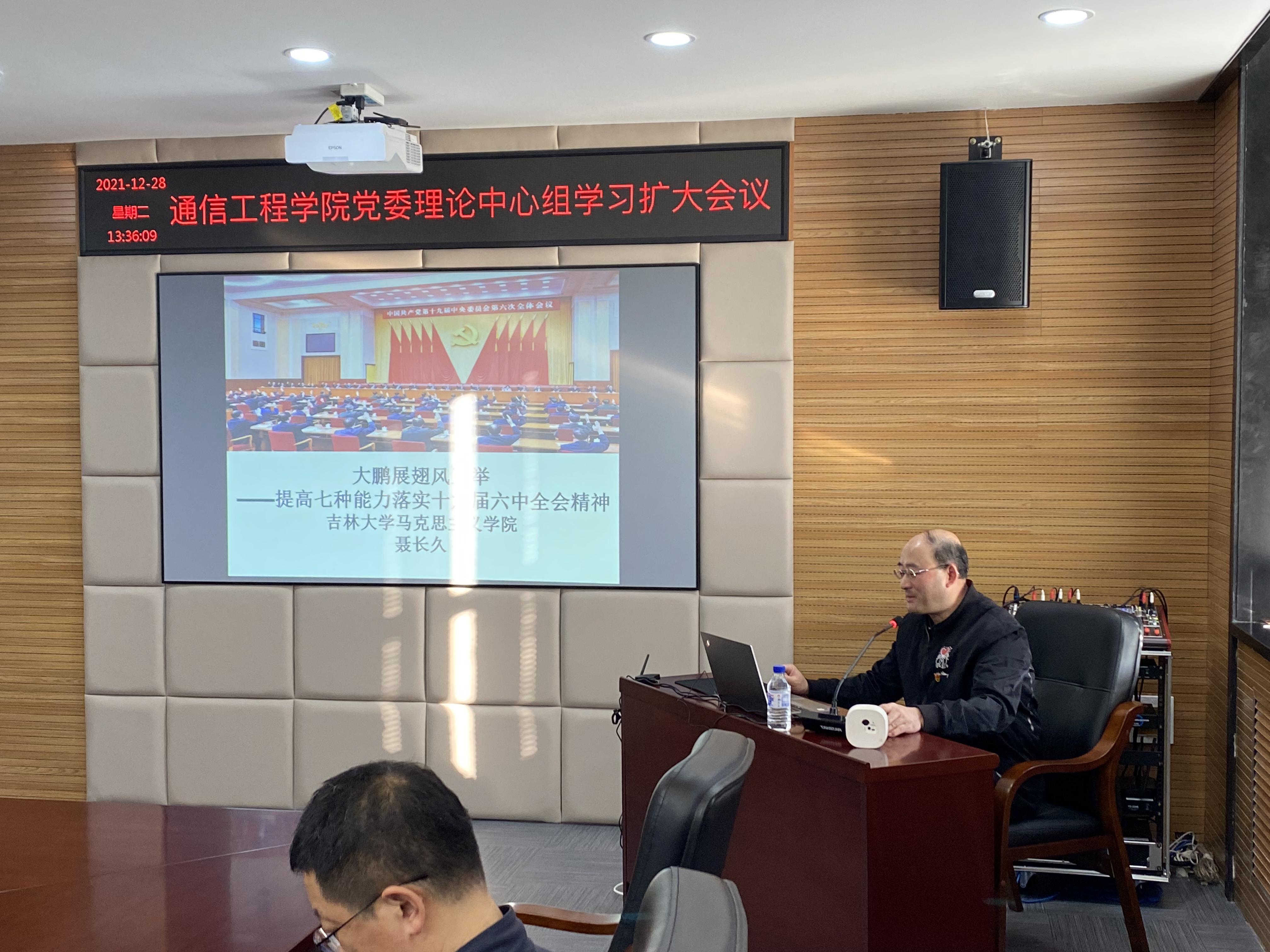 召开党委理论学习中心组扩大会议学习十九届六中全会精神和第十五次党代会精神,学院班子成员、党委委员、纪委委员、系主任、党支部书记、全体行政人员和学生代表参加了会议。会议由学院党委书记郑东主持。