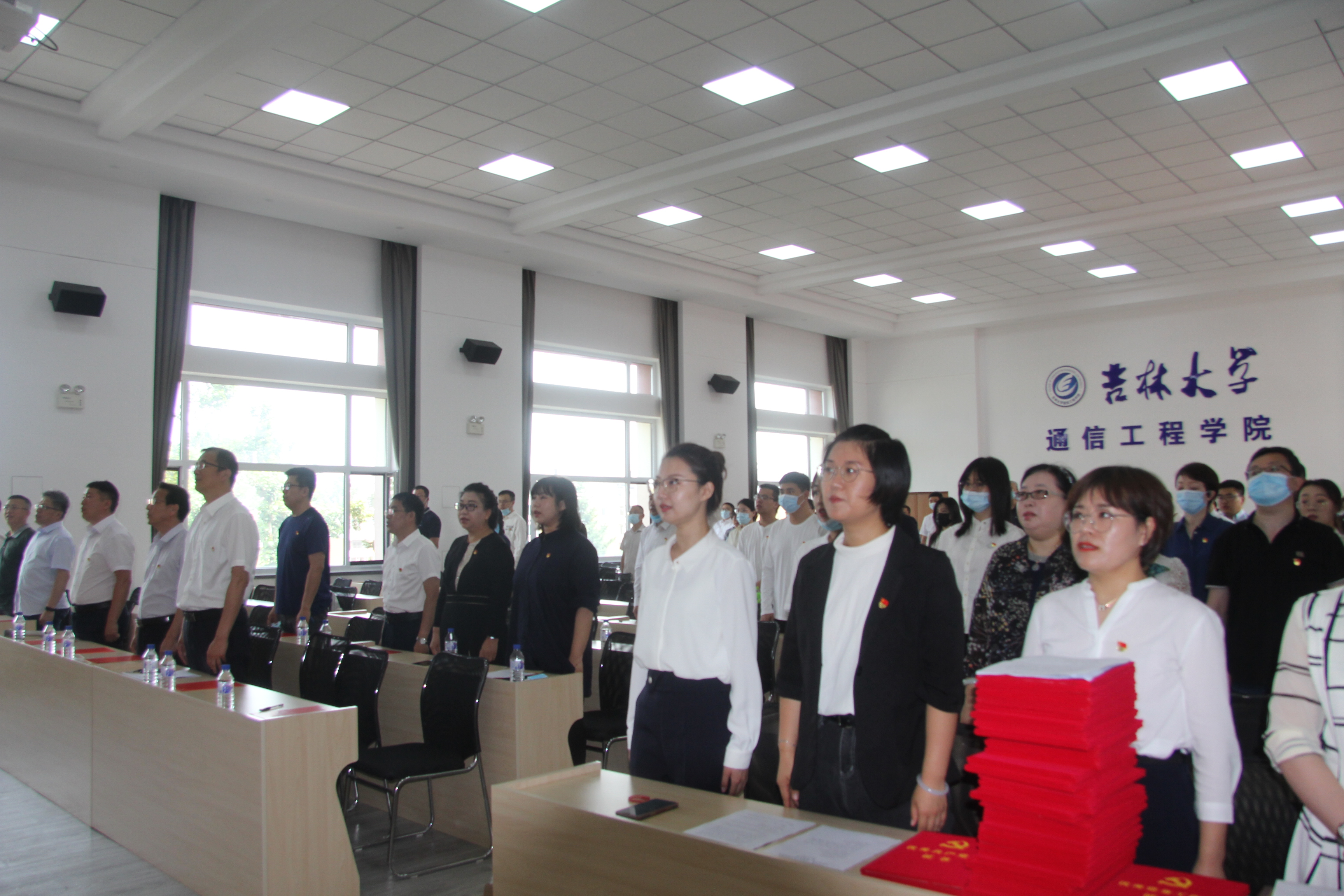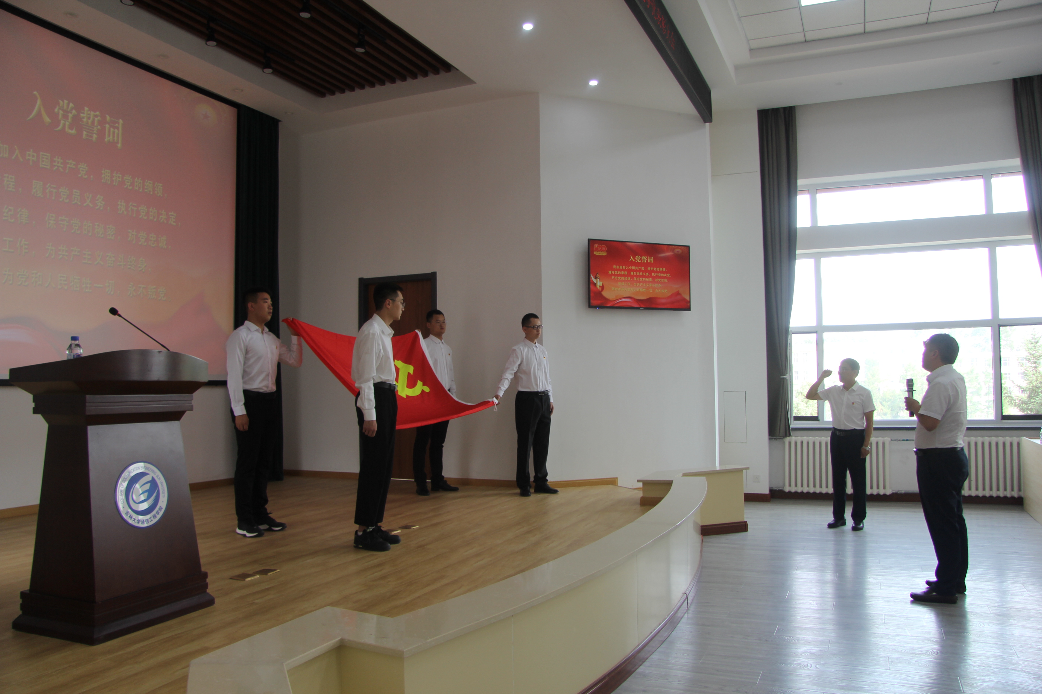 伴随着激昂雄壮的国歌,大会正式开始。随后,全体党员举起右手,面对着鲜红的党旗,庄严宣誓,激昂的宣誓声响彻整个会场。预备党员代表李卓菲同学代表全体新党员发言,她表示要恪守在党旗下的诺言,严格要求自己, 以行动践行入党誓言,肩负起党和人民的重托,为共产主义奋斗终身。