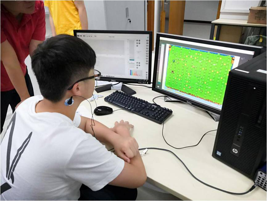Mr. Wan Feng from the Department of Electrical and Computer Engineering helped the delegation cultivate a more intuitive understanding of the scientific research projects by showing three authentic experiments. The first experiment was the concentration training project, in which different concentration levels were regulated to control the wind power of different frequencies to drive the balls over obstacles. The second experiment was to have the subjects control alpha waves below a threshold to control the movement of insects. The third experiment revolved around observing the waves of the same frequency in the brain generated by two strobe squares of different frequencies and after obtaining these waves with an instrument, controlling the car to move back and forth with algorithms.