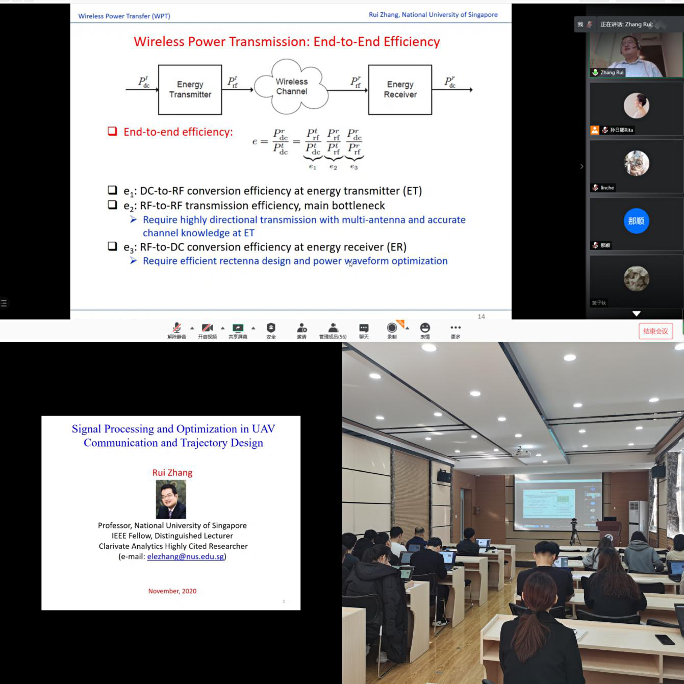 From November 16 to 20, 2020, Professor Rui Zhang from National University of Singapore participated in three online academic activities held by College of Communication Engineering. The lectures were chaired by Professor Hu Fengye and synchronously conducted via online and offline platforms. More than 200 students and teachers participated in the activities.