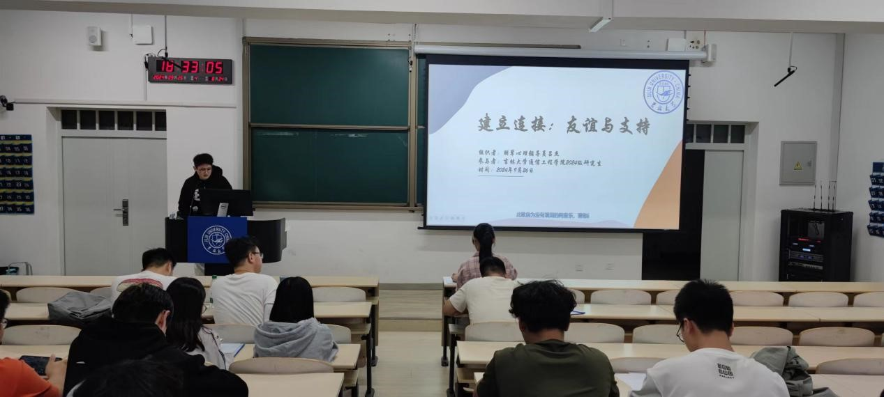 于2024年9月26日在南湖校区第一教学楼第八阶梯教室开展以“我们是相亲相爱的一家人”为主题的新生班级团体心理辅导。本次活动通过分组游戏的方式帮助新同学快速适应集体,建立新的人际关系,以更好的迎接研究生阶段面对的挑战。