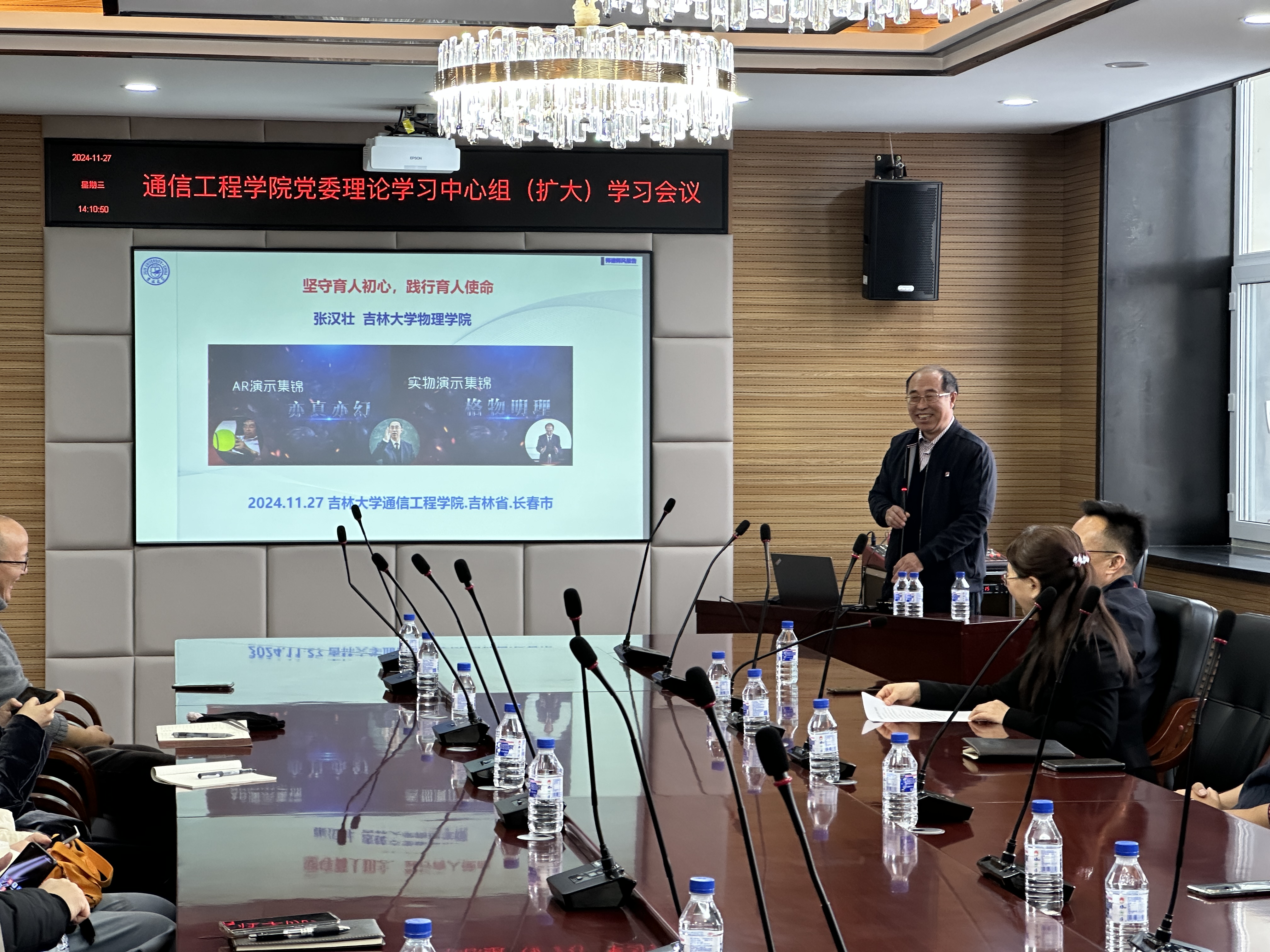 在南湖校区办公楼508会议室召开党委理论中心组(扩大)学习会议。会议邀请了物理学院博士生导师、校教学委员会主任委员张汉壮教授以“坚守育人初心,践行育人使命”为题进行专题辅导讲座。学院领导班子成员、党委委员、纪委委员、教工党支部书记、机关全体行政人员、教师代表参会学习,副院长赵岩教授主持会议。