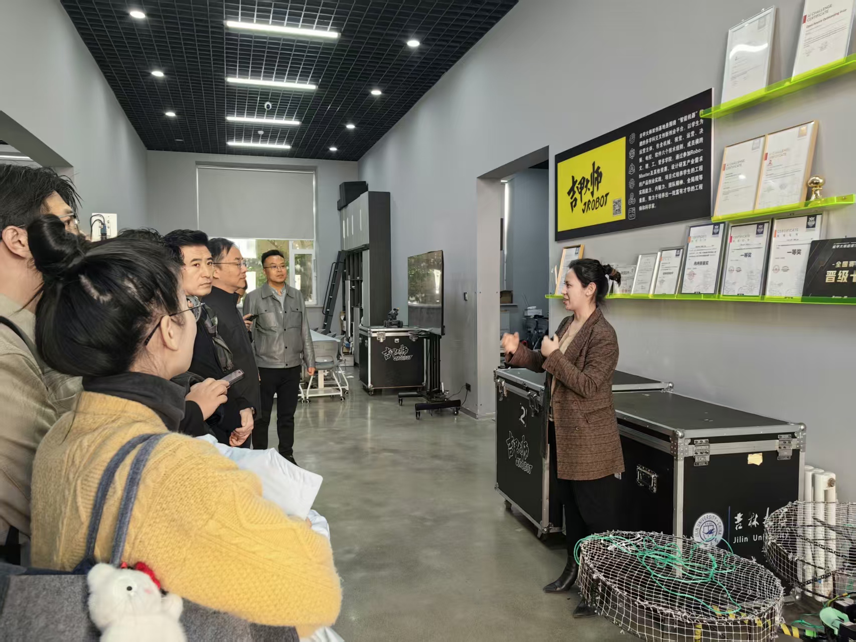 座谈会结束后,学院领导班子陪同上汽集团一行参观了“吉甲大师双创基地”。基地负责人玄玉波老师详细介绍了基地发展历程与建设成果,并重点介绍了通过机甲大师赛事以及校企科研合作做对学生在创新能力、动手能力、团队能力、就业能力等方面的提升。张小龙部长对学院的培养理念深表赞同,他坦言当前汽车行业竞争激烈,企业对高素质人才的需求极为迫切,上汽集团始终秉持“求贤若渴”的态度,期待与学院携手培养更多符合行业需求的优秀人才,共同推动汽车行业高质量发展。