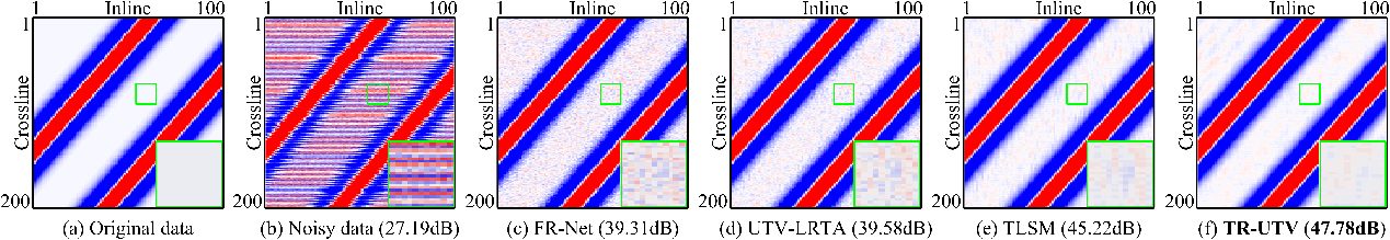 论文简介:针对现有低秩张量去噪方法未能充分利用地震数据在不同模态间相关性的问题,提出了一种张量环分解与单向全变差相结合的TR-UTV去噪方法。该方法利用张量环分解有效刻画地震数据的低秩结构,同时通过单向全变差正则化抑制脚印噪声。此外,论文提出了一种基于交替方向乘子法的求解算法。实验结果显示,TR-UTV在噪声去除与反射事件保真度方面均优于现有方法,如图2所示。