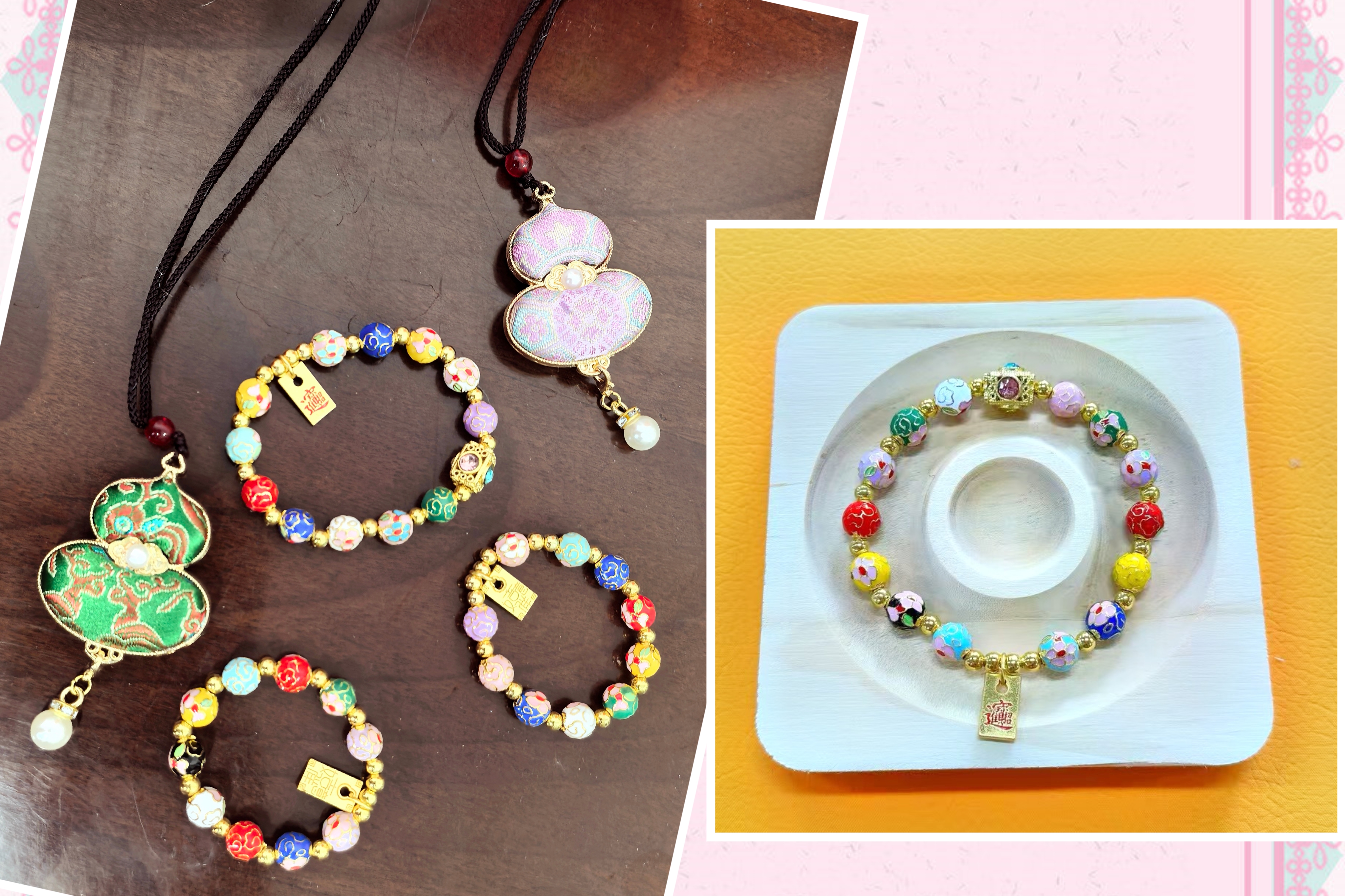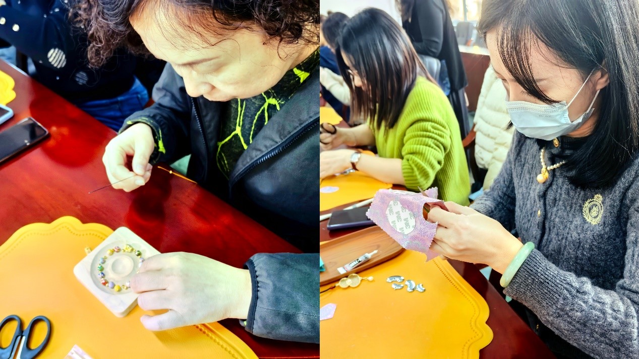 接下来,手作指导老师通过PPT为大家介绍了身为“燕京八绝”之一的景泰蓝和中国“锦绣之冠”的宋锦,并详细讲解了葫芦宋锦吊坠和景泰蓝手串的基本制作方法、配色搭配及收尾方法,从穿线、打结到珠子的排列组合,一步步耐心示范,手把手解答大家的疑问。创作过程中,女教职工们充分发挥想象力与创造力,时而相互交流技巧、分享灵感,现场欢声笑语不断。一块块华丽的宋锦布料被剪成葫芦形状,一颗颗小巧玲珑的珠子在指尖流转,每一件作品都承载着大家的巧思与心意。